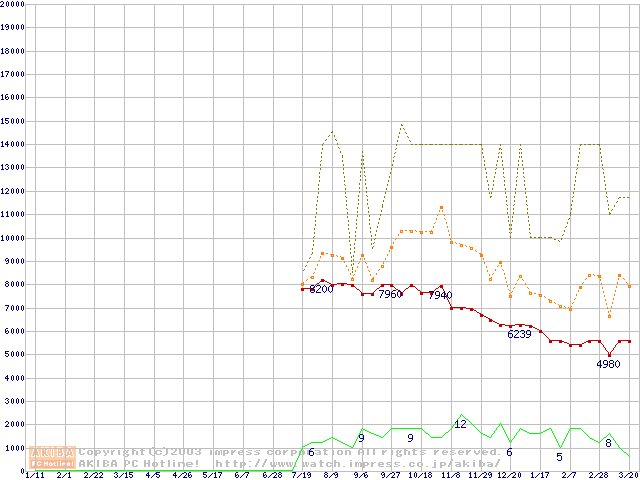 PC4000(DDR500) DDR SDRAM DIMMの最安値推移