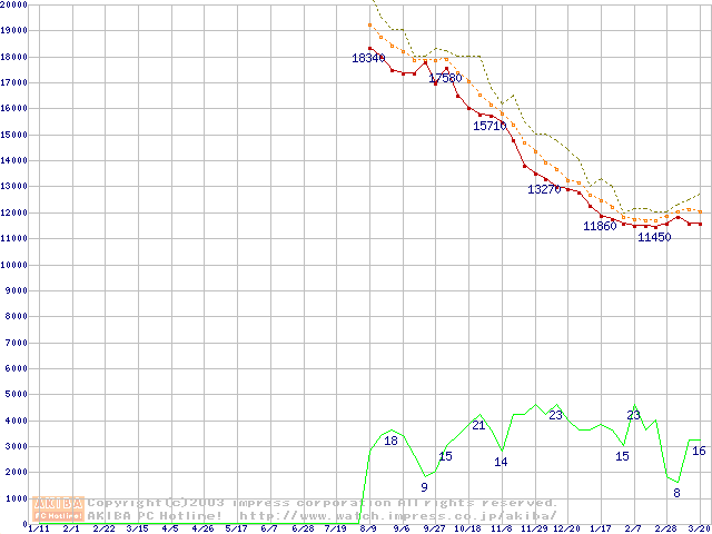 HDD主要製品(最安値1万円~1万5千円未満)の最安値推移