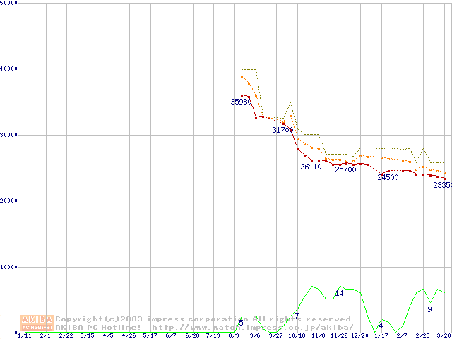 Travelstar 5K80 (9.5mm,5400rpm,UltraATA/100,8MB,FDB,40GB/Platter)の最安値推移