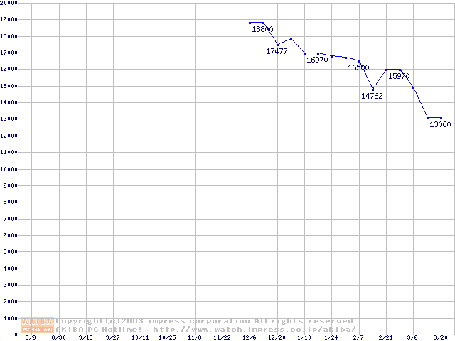 | [↑前グラフ]: | MHT20x0ATシリーズ (9.5mm,4200rpm,UltraATA/100,2MB,FDB,40GB/Platter,FDB)の最安値推移 |