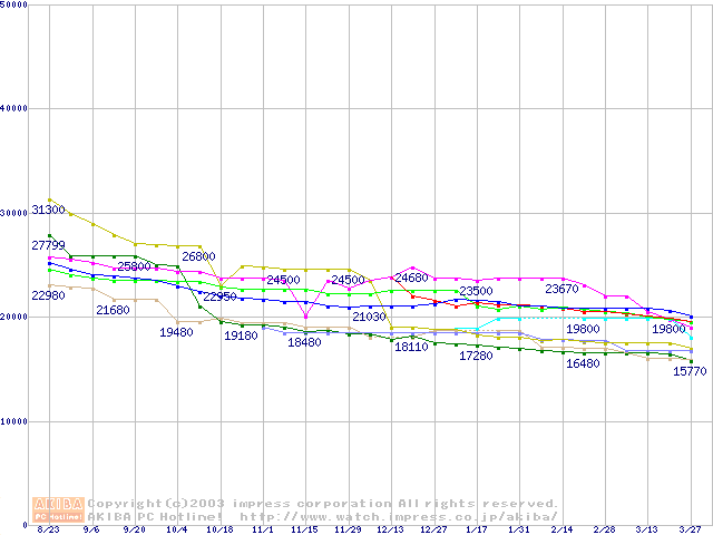| [↓次グラフ]: | 2.5インチHDD主要製品(最安値2万円~3万円未満)の最安値推移 |