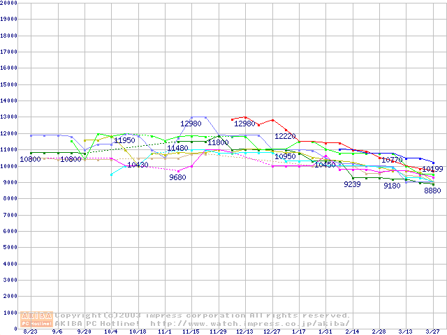| [↑前グラフ]: | 2.5インチHDD主要製品(最安値2万円~3万円未満)の最安値推移 |