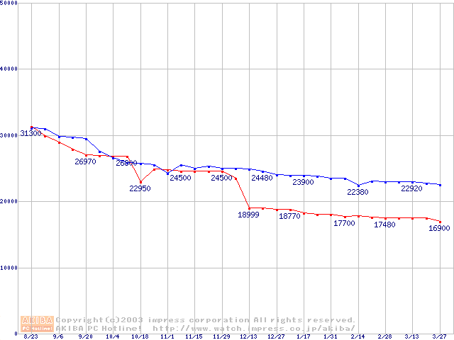 | [↓次グラフ]: | 2.5インチHDD 60GB~80GB未満(9.5mm厚,4200rpm)の最安値推移 |