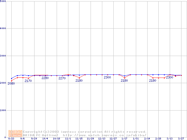 メモリ主要製品(最安値5千円未満)の最安値推移