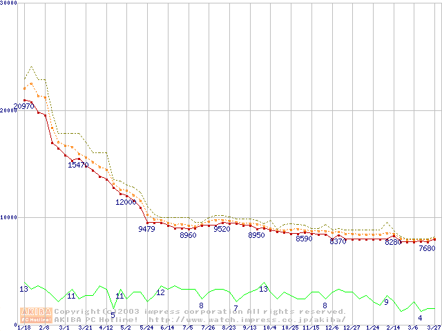 Socket A (OPGA,FSB 266MHz,L2 256KB,Thoroughbred)の最安値推移