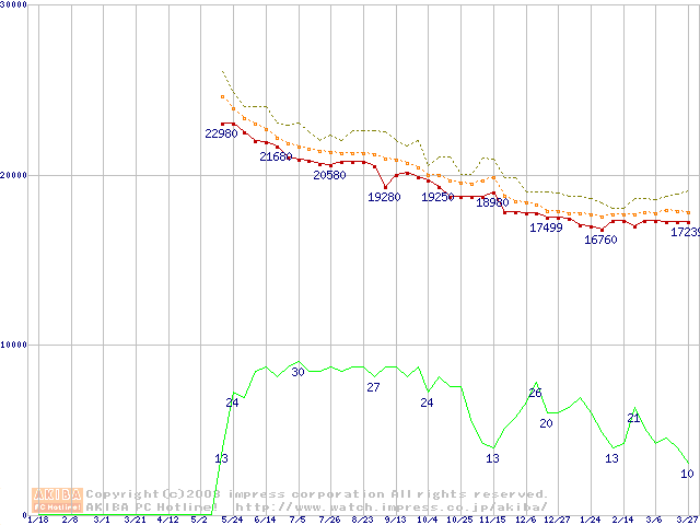 Socket 478 (micro-PGA,FSB 800MHz,L2 512KB,Hyper-Threading,Northwood)の最安値推移