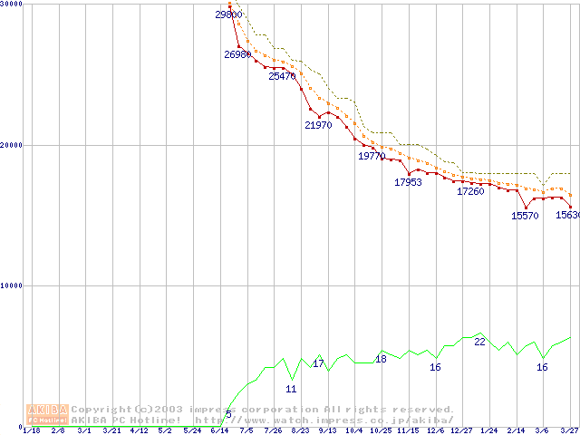 HDD主要製品(最安値1万5千円~2万円未満)の最安値推移