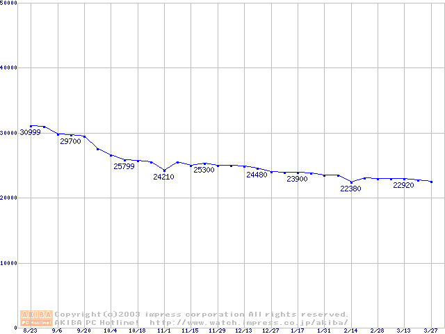| [↑前グラフ]: | Travelstar E7K60 (9.5mm,7200rpm,UltraATA/100,8MB,FDB,30GB/Platter)の最安値推移 |