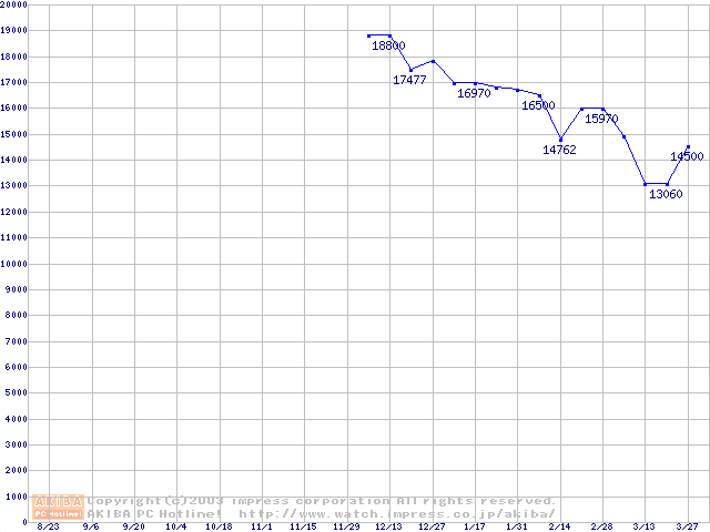 | [↑前グラフ]: | MHT20x0ATシリーズ (9.5mm,4200rpm,UltraATA/100,2MB,FDB,40GB/Platter,FDB)の最安値推移 |