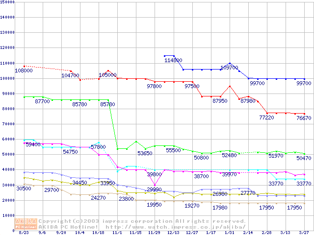 | [↓次グラフ]: | Socket A (OPGA,FSB 400MHz,L2 512KB,Barton)の最安値推移 |