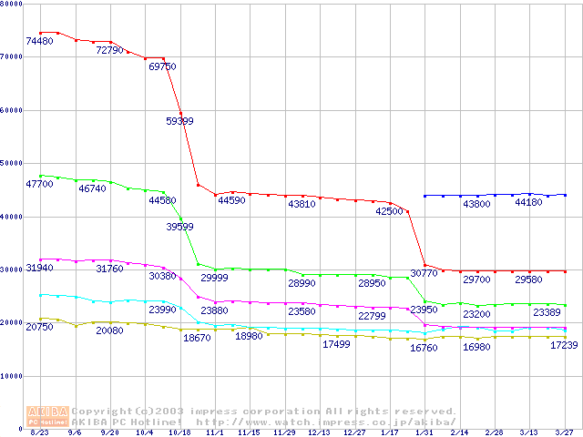 | [↓次グラフ]: | Socket 478 (micro-PGA,FSB 533MHz,L2 512KB,Hyper-Threading,Northwood)の最安値推移 |
