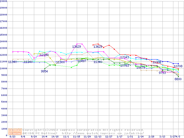 | [↑前グラフ]: | 2.5インチHDD主要製品(最安値2万円~3万円未満)の最安値推移 |