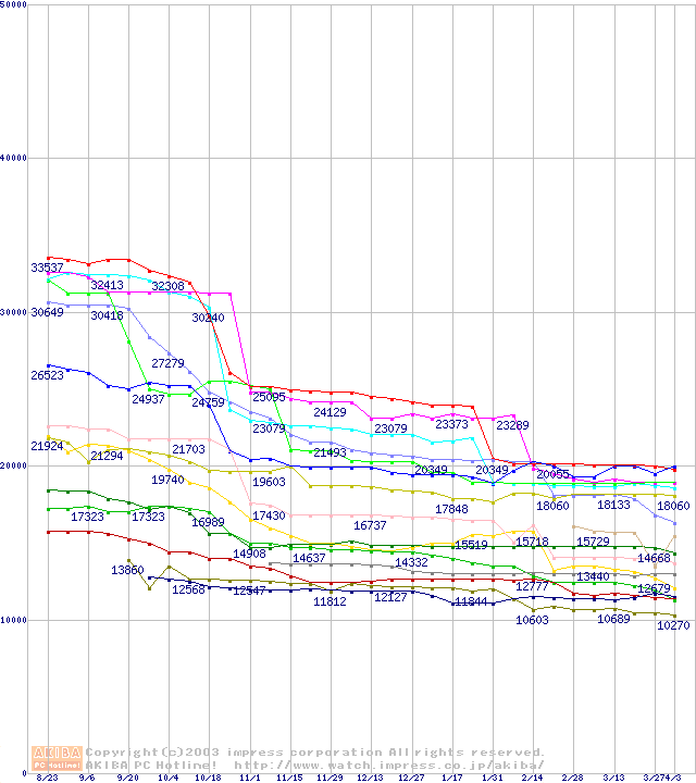 CPU主要製品(最安値2万円~3万円未満)の最安値推移