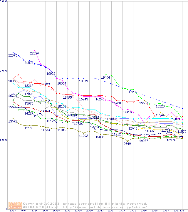 HDD主要製品(最安値1万5千円~2万円未満)の最安値推移