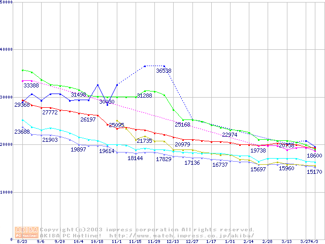 HDD主要製品(最安値1万5千円~2万円未満)の最安値推移