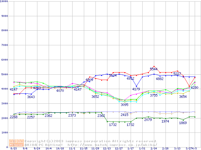 メモリ主要製品(最安値5千円未満)の最安値推移