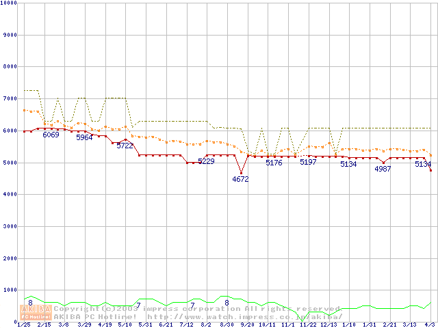 | Athlon 1.33GHz(FSB266) バルクの価格推移(税込み相当額) |