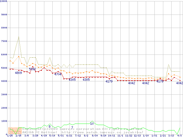 | Celeron 1GHz FC-PGA バルクの価格推移(税込み相当額) |