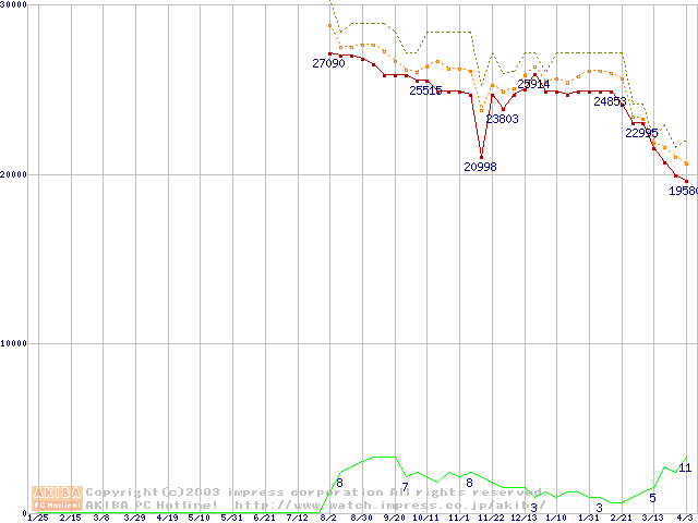 MHT20x0ATシリーズ (9.5mm,4200rpm,UltraATA/100,2MB,FDB,40GB/Platter,FDB)の最安値推移