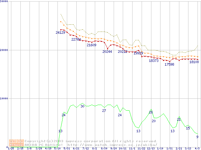 Socket 478 (micro-PGA,FSB 800MHz,L2 512KB,Hyper-Threading,Northwood)の最安値推移