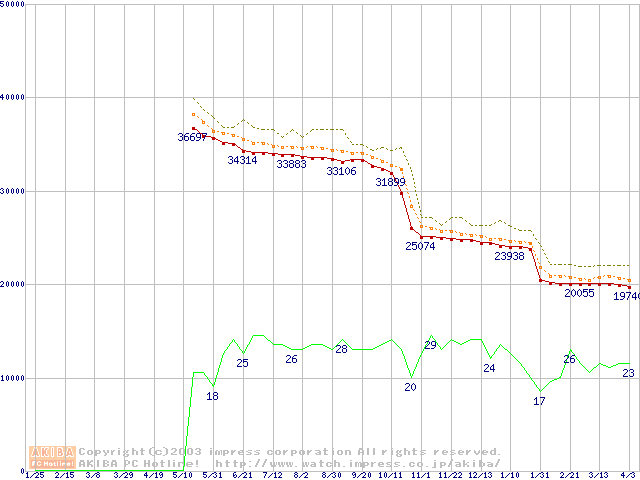 Socket 478 (micro-PGA,FSB 800MHz,L2 512KB,Hyper-Threading,Northwood)の最安値推移