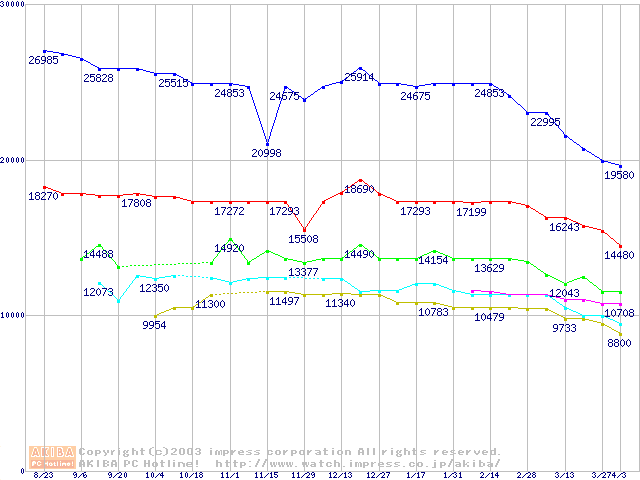 | [↑前グラフ]: | MHT20x0AHシリーズ (9.5mm,5400rpm,UltraATA/100,8MB,FDB,40GB/Platter,FDB)の最安値推移 |