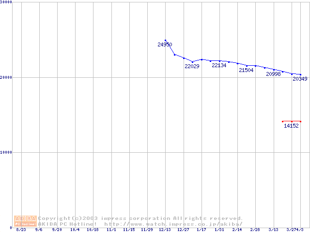 | [↑前グラフ]: | Travelstar 40GNX (9.5mm,5400rpm,UltraATA/100,8MB,FDB,20GB/Platter)の最安値推移 |