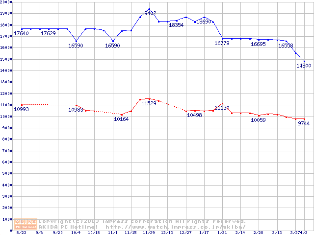 | [↓次グラフ]: | MHT20x0AHシリーズ (9.5mm,5400rpm,UltraATA/100,8MB,FDB,40GB/Platter,FDB)の最安値推移 |