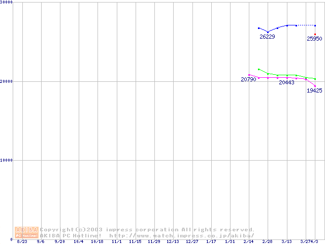 | [↑前グラフ]: | Socket 478 (micro-PGA,FSB 800MHz,L2 512KB,L3 2MB,Hyper-Threading,Gallatin)の最安値推移 |