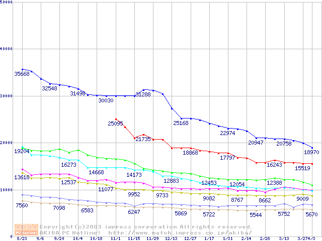 | [↓次グラフ]: | Deskstar 180GXP (7200rpm,8MB,UltraATA/100,FDB)の最安値推移 |