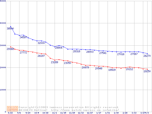 | [↑前グラフ]: | DiamondMax Plus 8 (7200rpm,2MB,UltraATA/133,FDB)の最安値推移 |