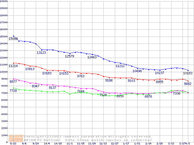 | [↑前グラフ]: | MaXLine II (5400rpm,UltraATA/133,2MB,80GB/Platter,BB)の最安値推移 |