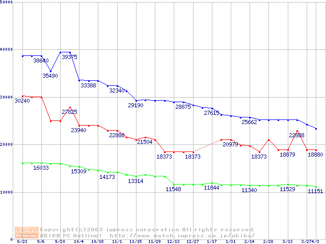 | [↓次グラフ]: | WD Caviar(Special Edition) (7200rpm,UltraATA/100,8MB)の最安値推移 |