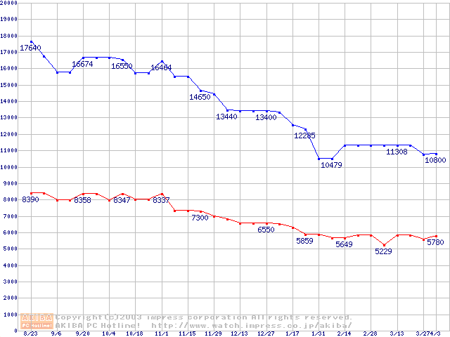 | [↓次グラフ]: | PC4300(DDR533) DDR SDRAM DIMMの最安値推移 |