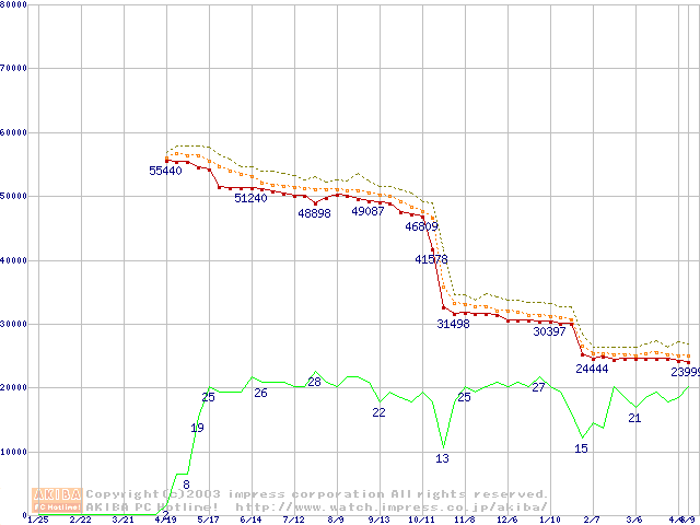 Socket 478 (micro-PGA,FSB 800MHz,L2 512KB,Hyper-Threading,Northwood)の最安値推移