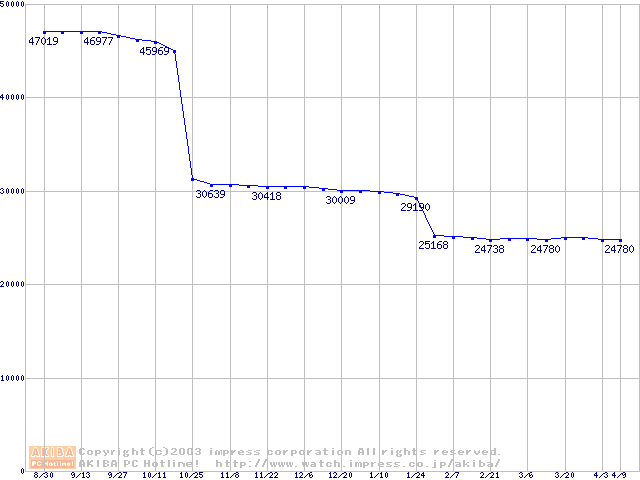 | [↑前グラフ]: | Socket 478 (micro-PGA,FSB 800MHz,L2 512KB,Hyper-Threading,Northwood)の最安値推移 |