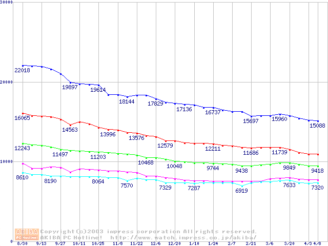| [↑前グラフ]: | MaXLine Plus II (7200rpm,8MB,UltraATA/133,FDB)の最安値推移 |