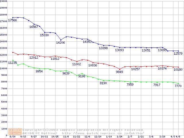 | [↓次グラフ]: | Barracuda 7200.7 Plus (7200rpm,UltraATA/100,8MB,100GB/Platter,FDB)の最安値推移 |