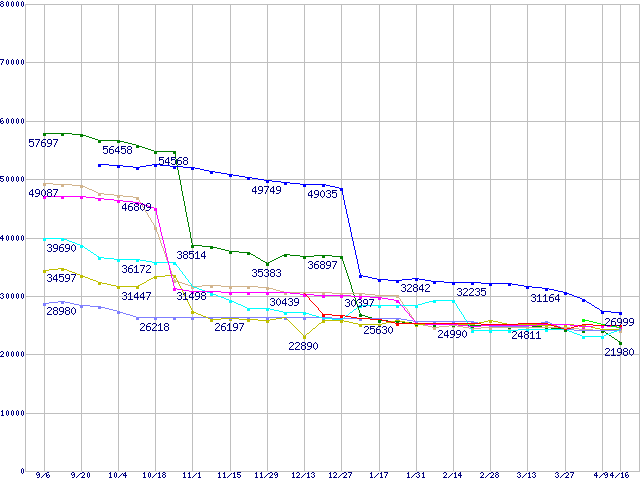 | [↑前グラフ]: | CPU主要製品(最安値1万円~2万円未満)の最安値推移 |