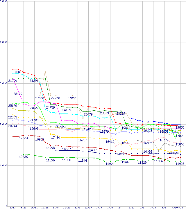 | [↑前グラフ]: | CPU主要製品(最安値1万円未満)の最安値推移 |