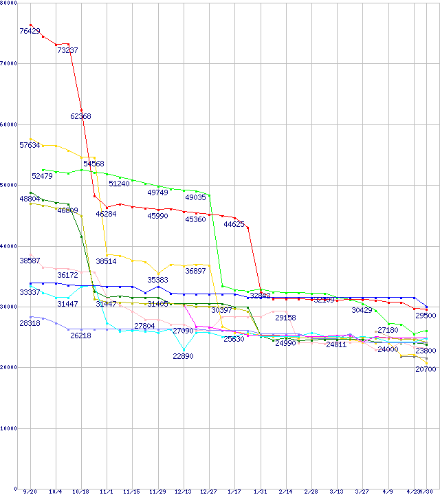 | [↑前グラフ]: | CPU主要製品(最安値1万円~2万円未満)の最安値推移 |
