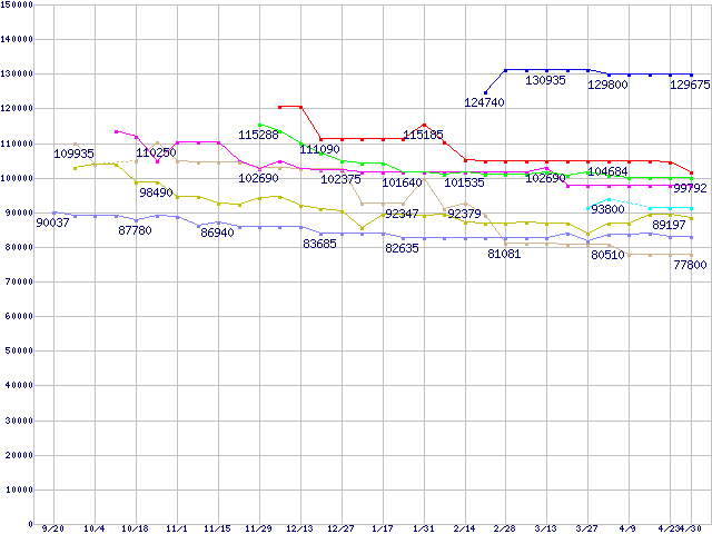 | [↑前グラフ]: | CPU主要製品(最安値3万円~6万円未満)の最安値推移 |