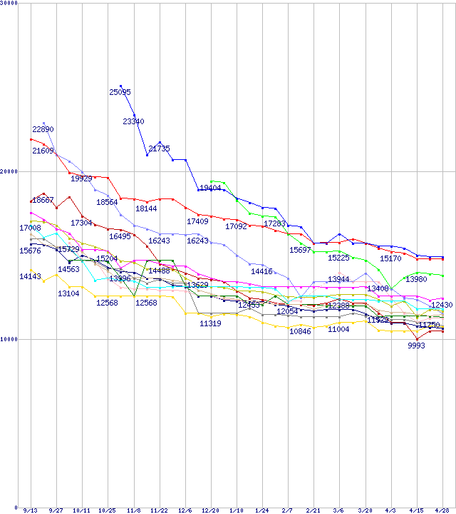 | [↓次グラフ]: | HDD主要製品(最安値1万5千円~2万円未満)の最安値推移 |