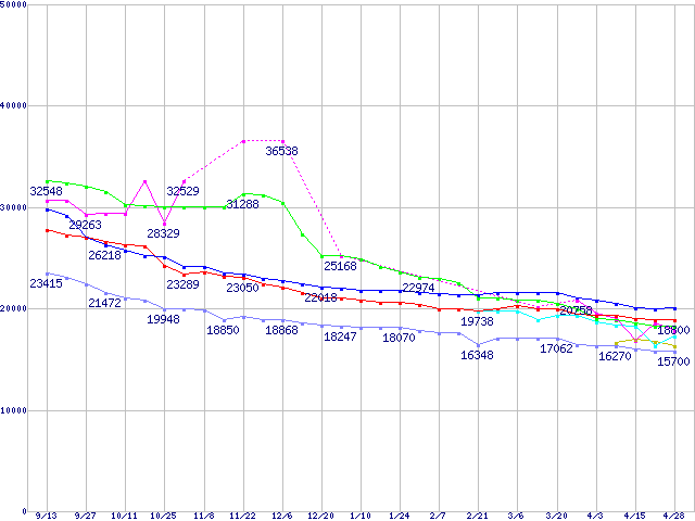 | [↓次グラフ]: | HDD主要製品(最安値2万円以上)の最安値推移 |