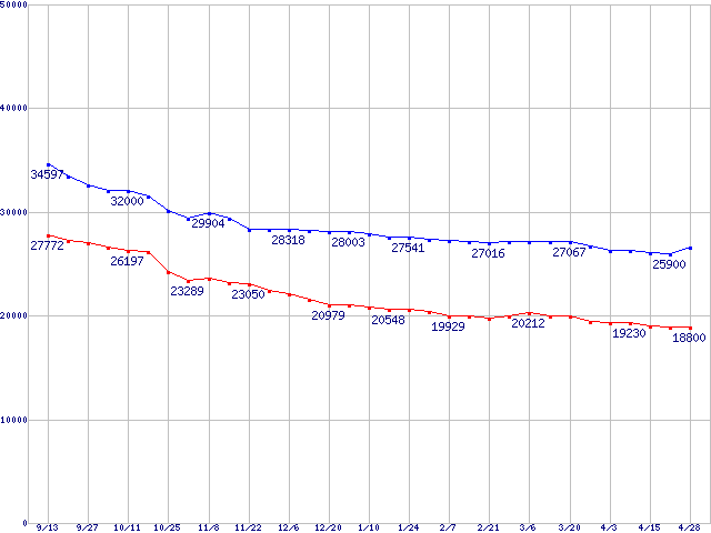 | [↑前グラフ]: | DiamondMax Plus 8 (7200rpm,2MB,UltraATA/133,FDB)の最安値推移 |