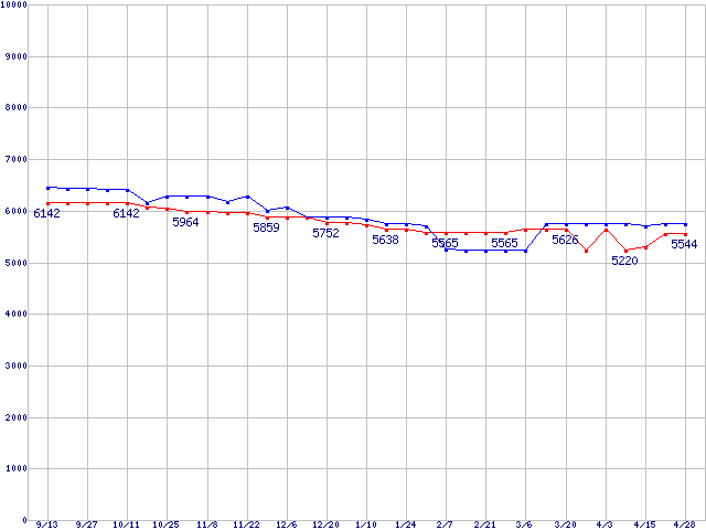 | [↑前グラフ]: | DiamondMax 16 (5400rpm,UltraATA/133,2MB,80GB/Platter,FDB)の最安値推移 |
