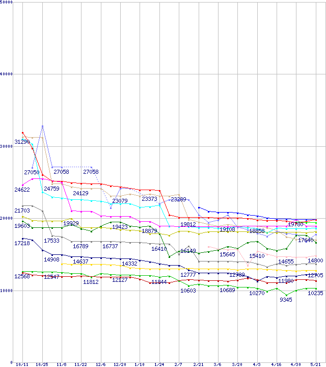 | [↓次グラフ]: | CPU主要製品(最安値2万円~3万円未満)の最安値推移 |