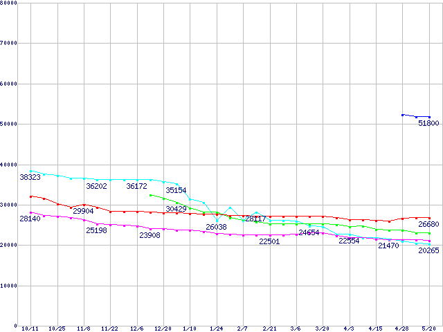| [↑前グラフ]: | HDD主要製品(最安値1万5千円~2万円未満)の最安値推移 |