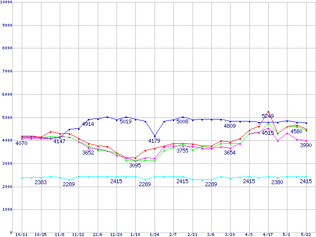 | [↓次グラフ]: | メモリ主要製品(最安値5千円~1万円未満)の最安値推移 |