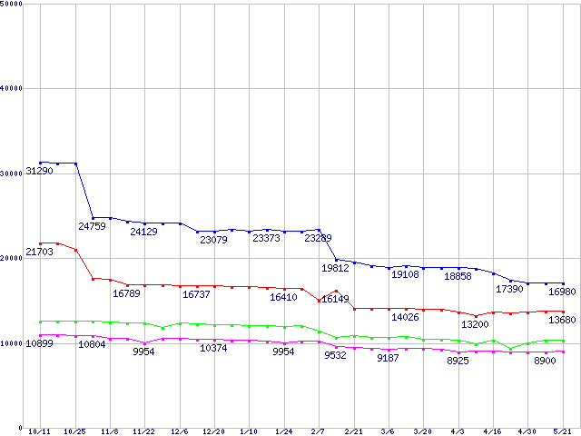 | [↑前グラフ]: | Socket A (OPGA,FSB 400MHz,L2 512KB,Barton)の最安値推移 |